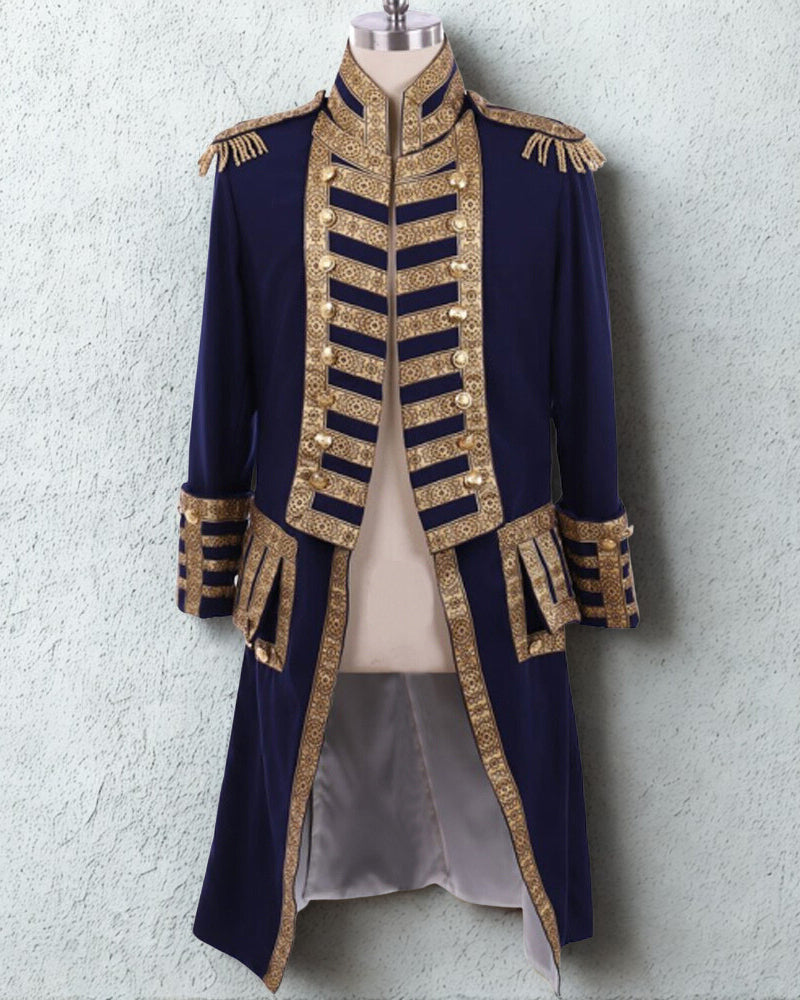 Step into history with the 18th Century Naval Officer Tailcoat, a handcrafted 18th-century naval officer uniform made of polyester. This costume includes the tailcoat, designed in deep blue with gold embroidery on the collar, cuffs, and edges to highlight rank and elegance. Structured shoulders, gold braid, and detailed buttons reflect military discipline, while the tailored waist and long coat silhouette add confidence and commanding presence.